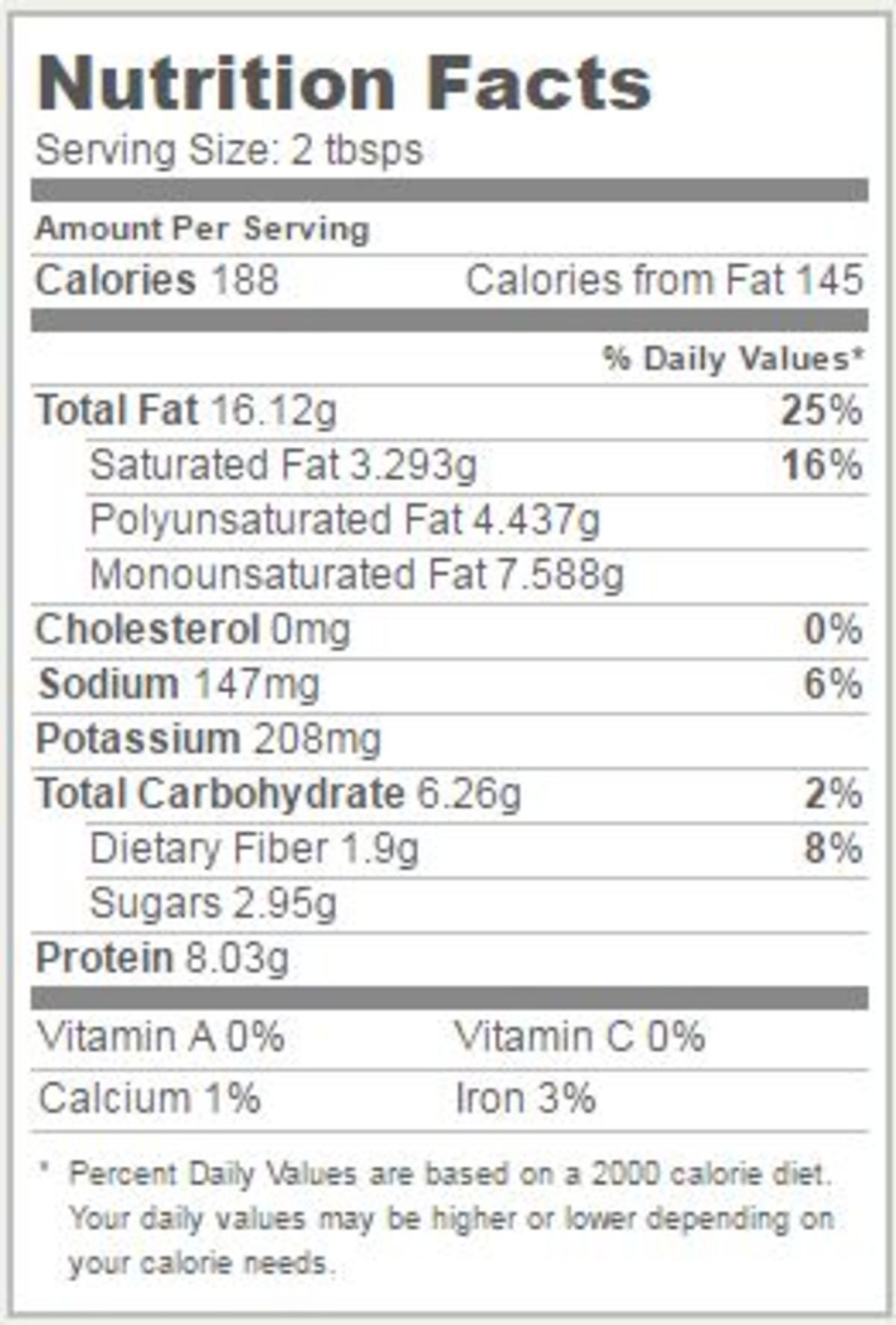 Οι θερμίδες στο φυστικοβούτυρο αναλύονται σε 72% λίπος, 12% υδατάνθρακες και 16% πρωτεΐνη.