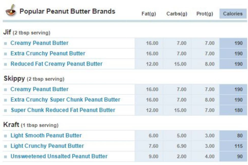 Στον δεύτερο πίνακα μπορείτε να δείτε τις ίδιες τιμές για τις πιο δημοφιλείς εμπορικές μάρκες φυστικοβούτυρου που θα βρείτε στα ράφια των καταστημάτων.