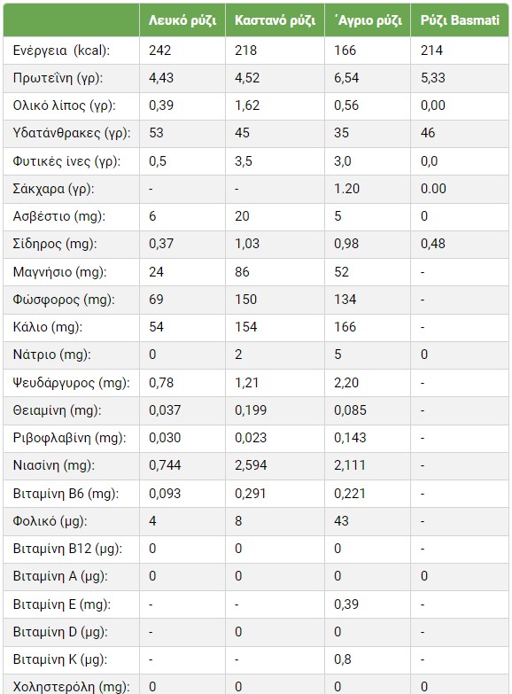 Δείτε αναλυτικά τη διατροφική αξία ανά φλιτζάνι μαγειρεμένου ρυζιού ανά είδος, στον πίνακα που ακολουθεί: