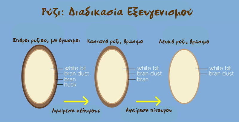 Η διαφορά του καφέ και του λευκού ρυζιού δε βρίσκεται μόνο στο χρώμα. Το ρύζι περιέχει πολλά στρώματα. Για την παραγωγή του καφέ ρυζιού αφαιρείται μόνο το εξωτερικό στρώμα, ο φλοιός. Αυτή η διαδικασία είναι η λιγότερο καταστρεπτική για τη διατροφική αξία του ρυζιού και εμποδίζει την απώλεια των θρεπτικών συστατικών που συμβαίνει με την περαιτέρω επεξεργασία του ρυζιού. Αν το καφέ ρύζι αλεσθεί περισσότερο ώστε να αφαιρεθεί το πίτυρο (περικάρπιο) και το σπέρμα (ο καρπός), το αποτέλεσμα είναι ένα λευκότερο ρύζι, το οποίο όμως έχει απογυμνωθεί από αρκετά θρεπτικά συστατικά. Το λευκό ρύζι παράγεται μετά από την αφαίρεση της εξωτερικής στοιβάδας του καρπού (περικάρπιο), η οποία περιέχει απαραίτητα λιπαρά οξέα